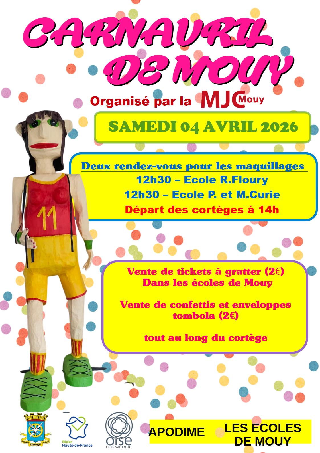 Agenda culturel Carnavavril de Mouy – 04/04/26 6 décembre 20212 septembre 2025 Dorian Ruault carnaval, carnavril Samedi 04 avril 2026 Deux rendez-vous :13h – Ecole R.Floury13h – Ecole P. et M.Curie Vente de tickets à gratter à 2€– Dans les écoles de Mouy– à la MJC, 6 rue Jules Ferry– Tout au long du cortège